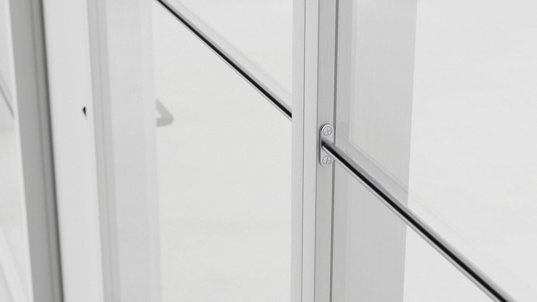 ALUFRAME -sujungus garsą sugeriančią stiklų sistemą su laisvai stovinčia aliuminio durų stakta, dar labiau sustiprėja įspūdis, kad durys laisvai plūduriuoja aplinkoje. Stiklo plokščių surinkimas vyksta su minimaliomis aliuminio juostomis viršuje ir apačioje ir suteikia labai stabilų sprendimą. Durys montuojamos į aliuminio staktą, su įstiklinta, iš dalies įstiklinta ar kitaip sandaria durų varčia, kuri gaminama norimos medienos rūšimi arba nudažyta bet kokia spalva.