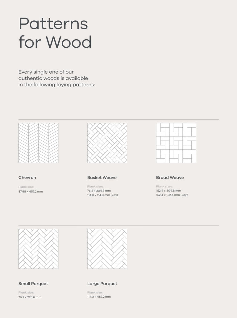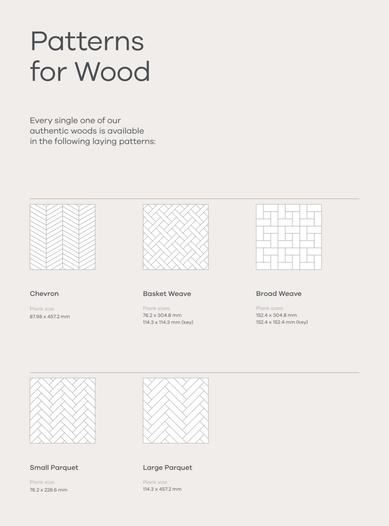 Siūlomi 6 grindų dizainai, tarp kurių Chevron'o, eglutės ir kiti motyvai.